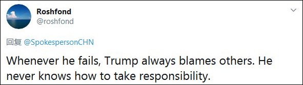 值得一提的是,上周美媒“Politico”曝光了一份共和黨內部的57頁(yè)備忘錄,指導共和黨候選人回應抗疫不力的問(wèn)題時(shí),甩鍋中國。當時(shí),華春瑩轉發(fā)時(shí)即配文說(shuō)到:“瞧瞧,真是一出好劇本!” 華春瑩最新的兩條推文下,有不少網(wǎng)友斥責特朗普和蓬佩奧甩鍋中國,阻撓全球抗疫。 例如,一名網(wǎng)友寫(xiě)到:“當特朗普失敗的時(shí)候,他從來(lái)都是指責別人,他永遠不知道如何負責任!